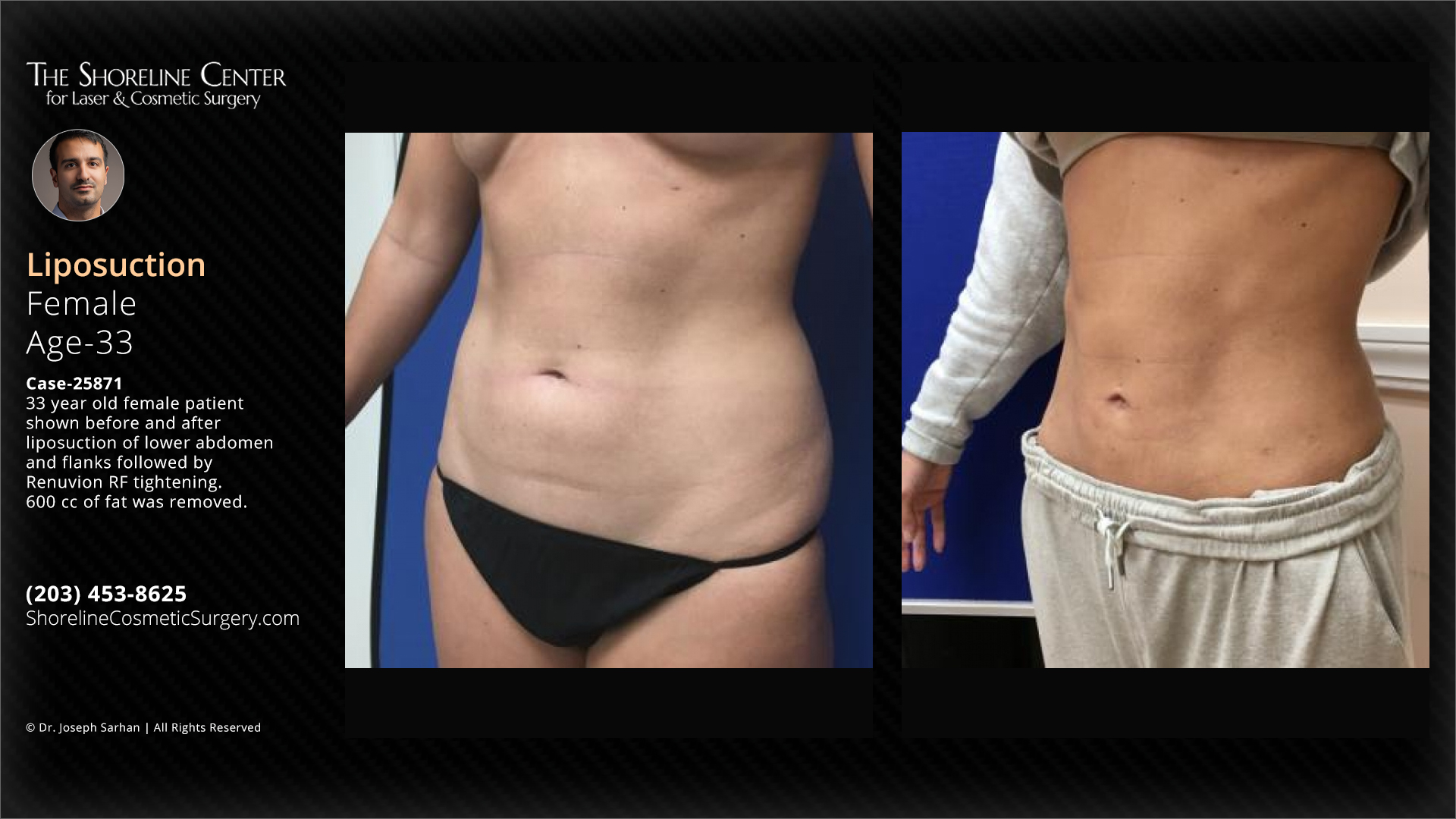 33 year old female patient shown before and after liposuction of lower abdomen and flanks followed by Renuvion RF tightening. 600 cc of fat was removed. Note flattened abdomen and sculpted waistline. Individual results may vary.