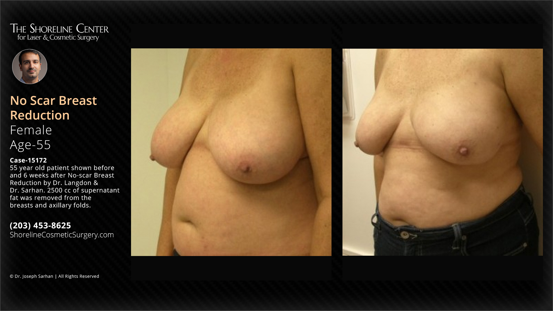 55 year old patient shown before and 6 weeks after No-scar Breast Reduction by Dr. Langdon & Dr. Sarhan. 2500 cc of supernatant fat was removed from the breasts and axillary folds. Individual results may vary.