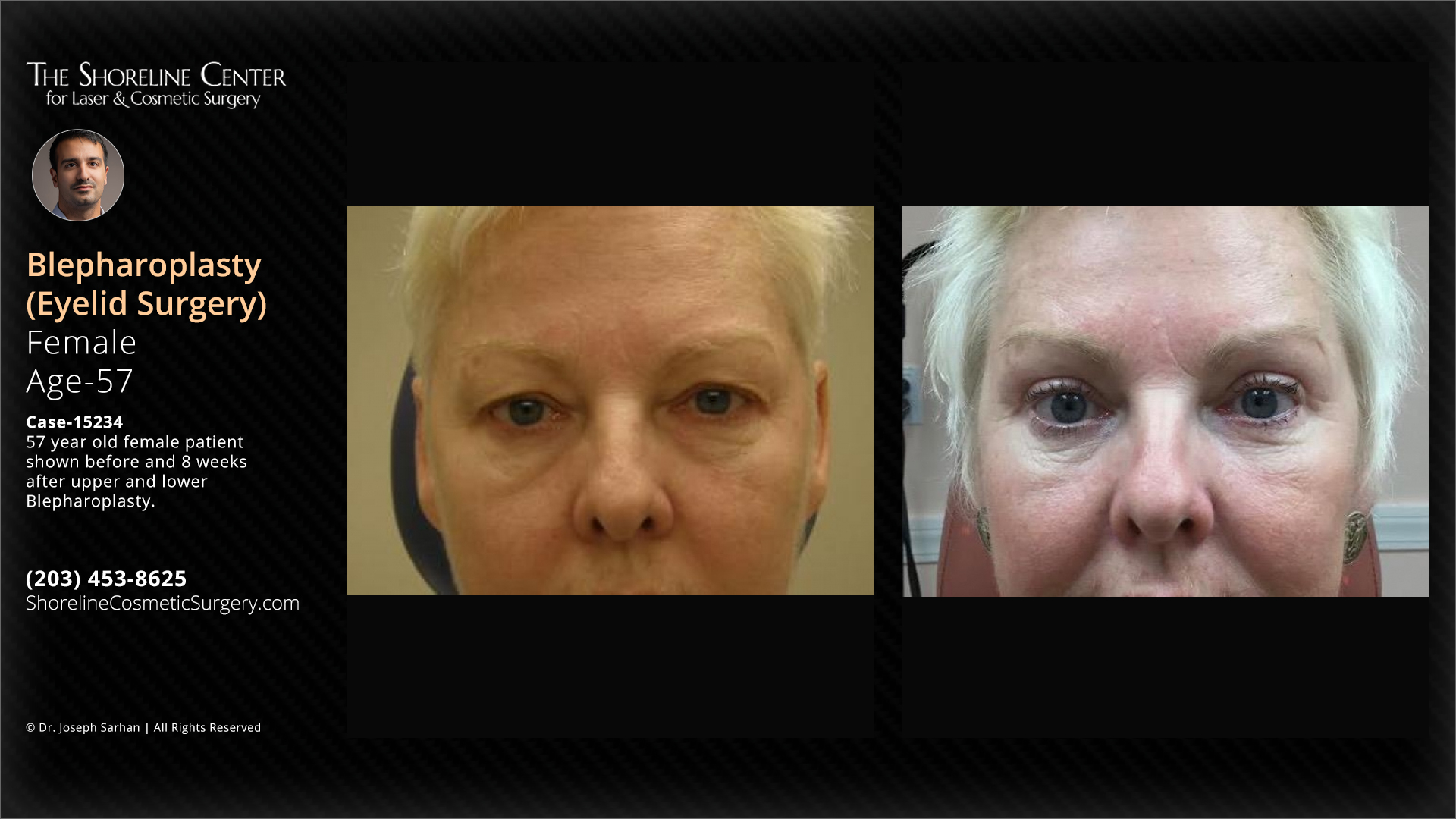 57 year old female patient shown before and 8 weeks after upper and lower Blepharoplasty. Individual results may vary.