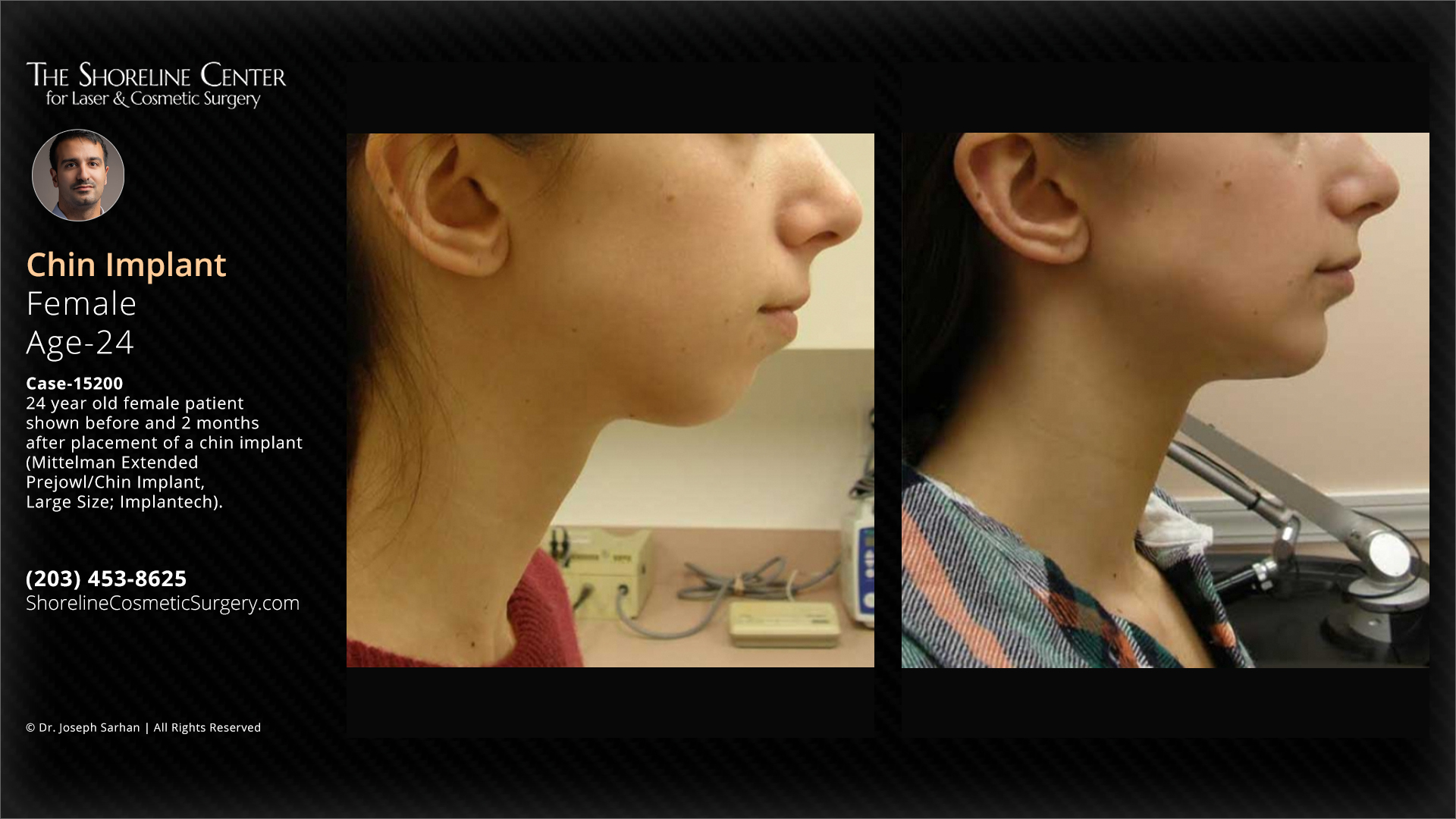 24 year old female patient shown before and 2 months after placement of a chin implant (Mittelman Extended Prejowl/Chin Implant, Large Size; Implantech). Implant was placed through a submental skin incision in the sub-periosteal location. Individual results may vary.