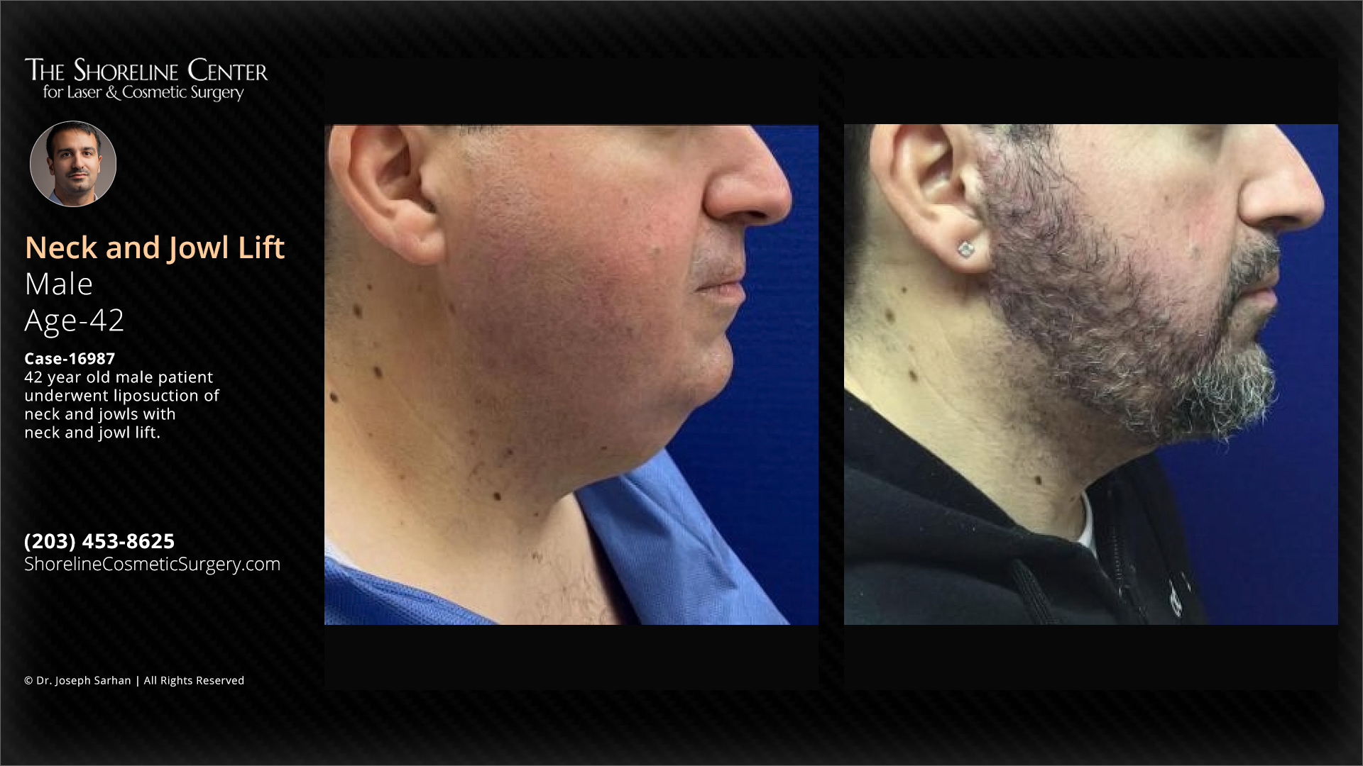 42 year old male patient underwent liposuction of neck and jowls with neck and jowl lift. 82 cc of supernatant fat was removed from the neck. 7 cc of fat was removed from the left jowl; 7 cc was removed from the right jowl. Photos shown are 6 weeks apart. Individual results may vary.