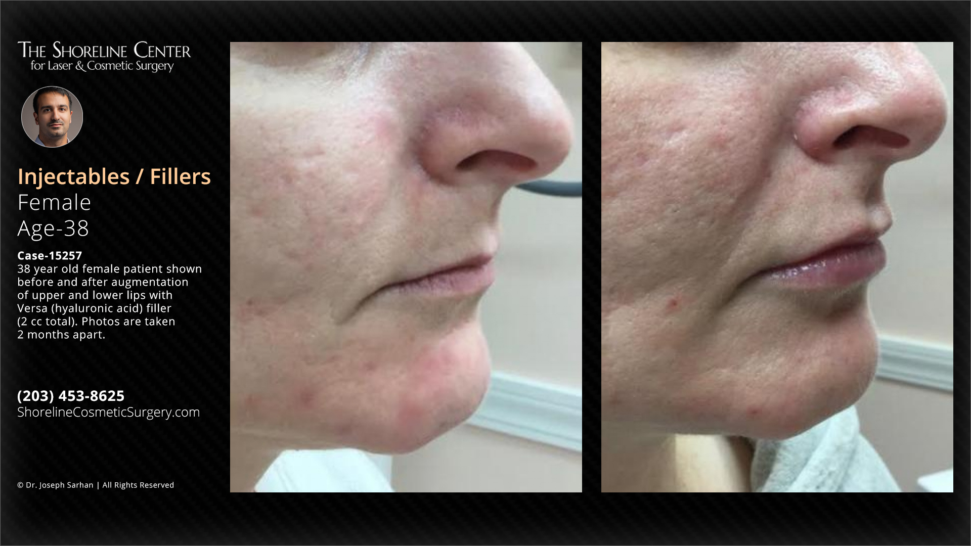 38 year old female patient shown before and after augmentation of upper and lower lips with Versa (hyaluronic acid) filler (2 cc total). Photos are taken 2 months apart. Individual results may vary.