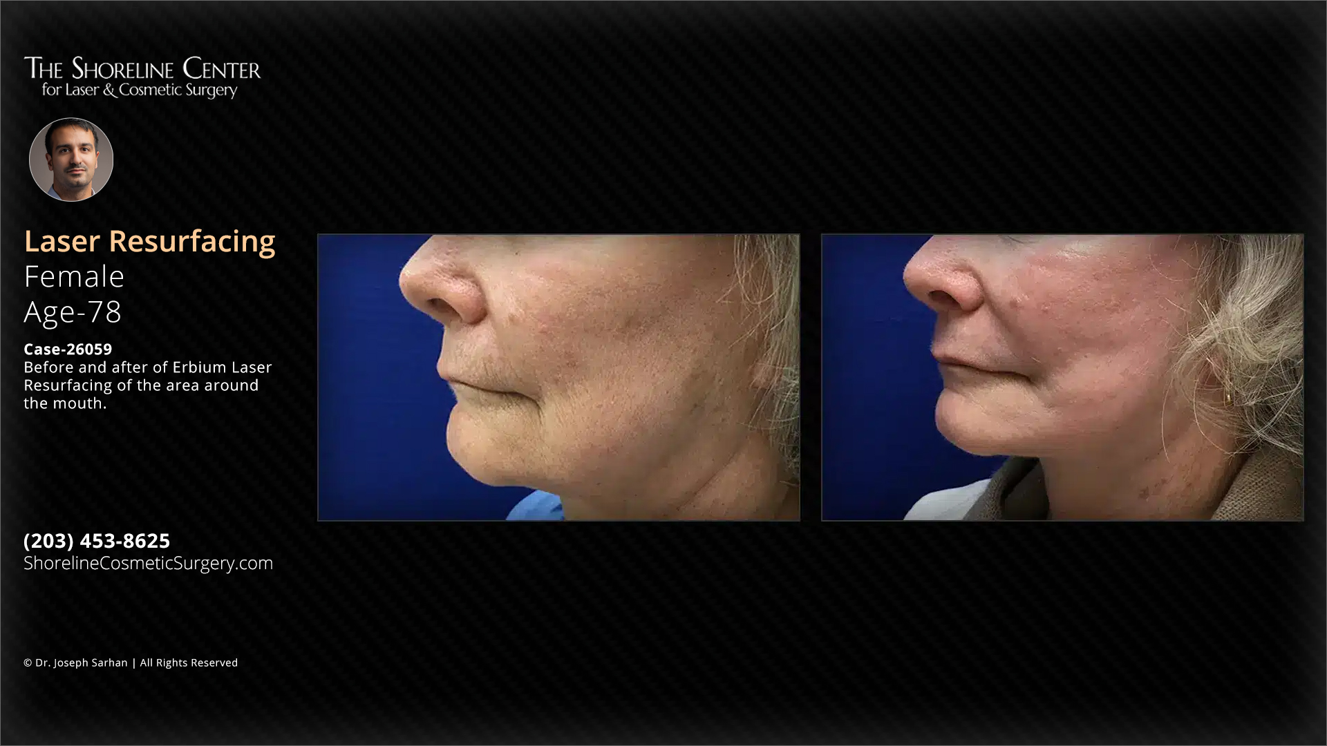 Before and after of Erbium Laser Resurfacing of the area around the mouth. Individual results may vary.